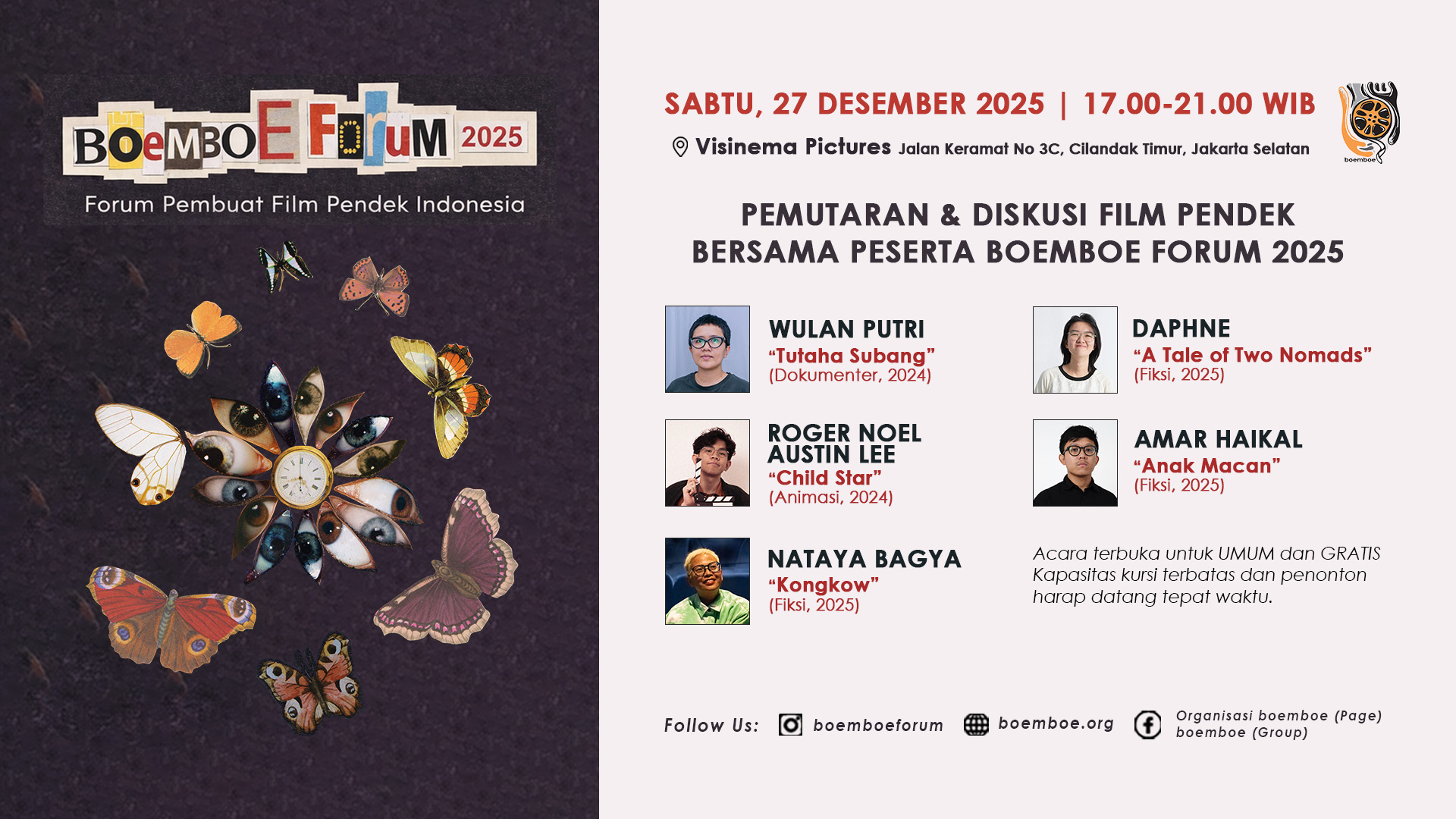 The name ‘boemboe’ originated from Indonesian word ‘bumbu’, which means ‘spice’. It describes the variation of Indonesian social culture reflected and styles in its short films. Founded in 2003 as a meeting point for everybody who concerns about the development of Indonesian short film. It also aims to develop the networking among Indonesian short filmmaker, film community, kine club, local film festival and at the same time to estblish a good relationship with short film event outside Indonesia. As an organization, we’re focusing on creating “a space to breath” for the Indonesian short film anywhere in the world. Now it has more focus on the short film outreach program. With our main partner COFFIE (Coordination for Film Festival in Indonesia) since 2012, boemboe organization is also working as the film festival consultant.